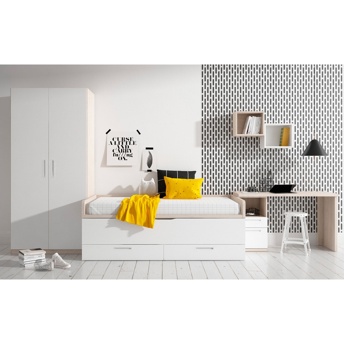Quarto Juvenil 2 Camas com 2 Gavetas e Encostos Baixos Mio