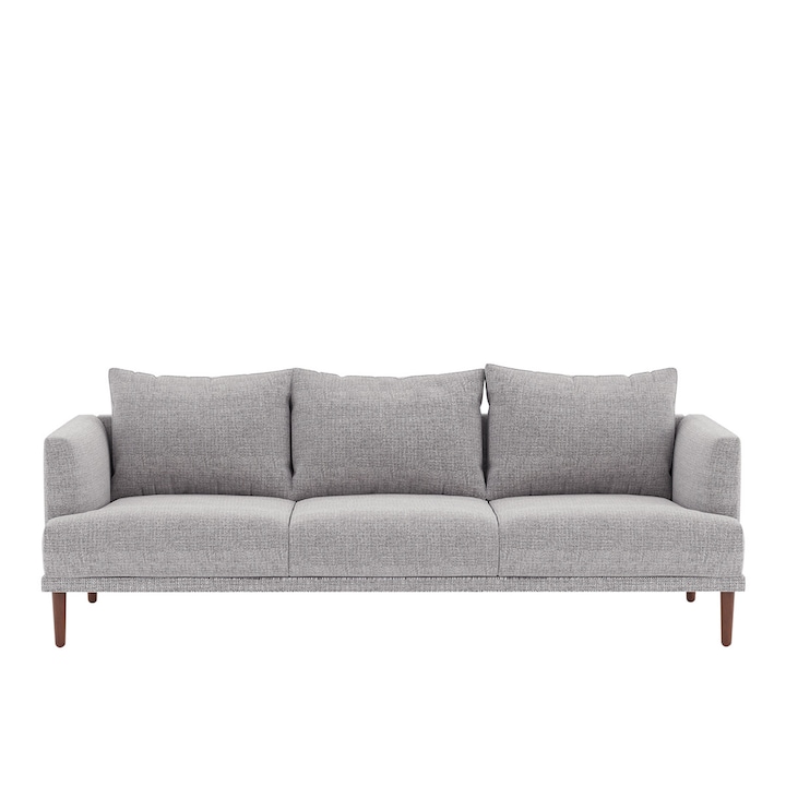 Sofá de 3 lugares com estrutura em madeira de pinho e aglomerado e estofos em tecido de poliéster. É um tecido texturizado.