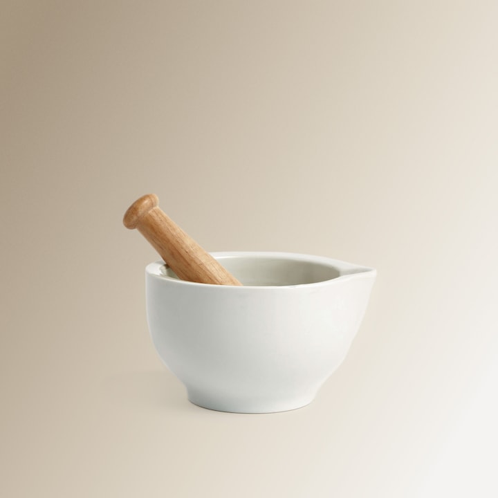 Morteiro de porcelana com cabo de madeira