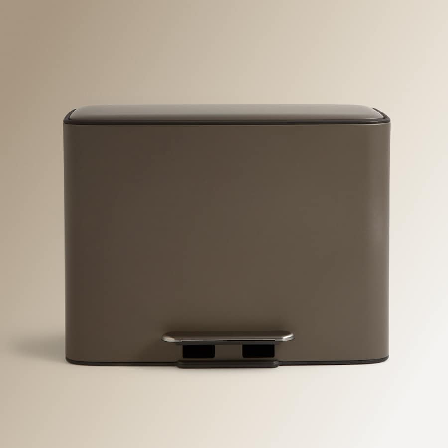 Caixote do lixo com pedal, fabricado em aço, que inclui um contentor interno com três baldes amovíveis de plástico para facilitar a separação de resíduos. A tampa mantém-se aberta para a substituição do saco e fecha de forma silenciosa ao largar o pedal. A superfície lisa facilita a limpeza e o produto foi concebido para se integrar na decoração da cozinha.