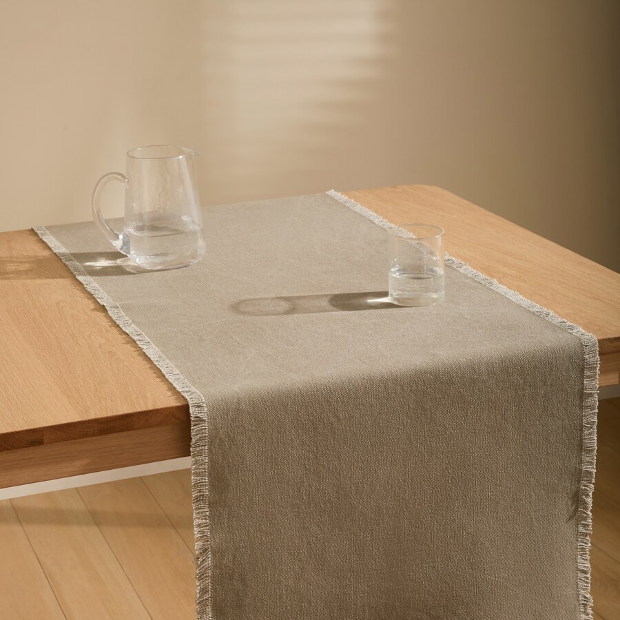Caminho de mesa de efeito lavado com franjas contrastantes.