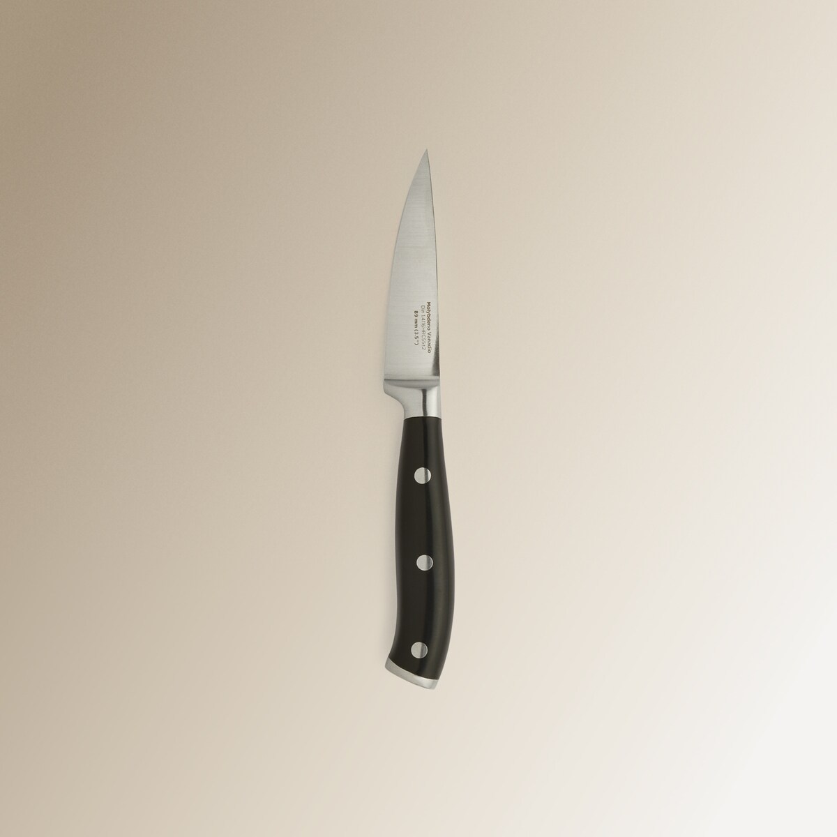 Faca de descascar fabricada em aço inoxidável com cabo ergonómico. Apresenta uma lâmina pequena com ponta arredondada que permite descascar, cortar, decorar e dar forma a frutas e legumes pequenos.