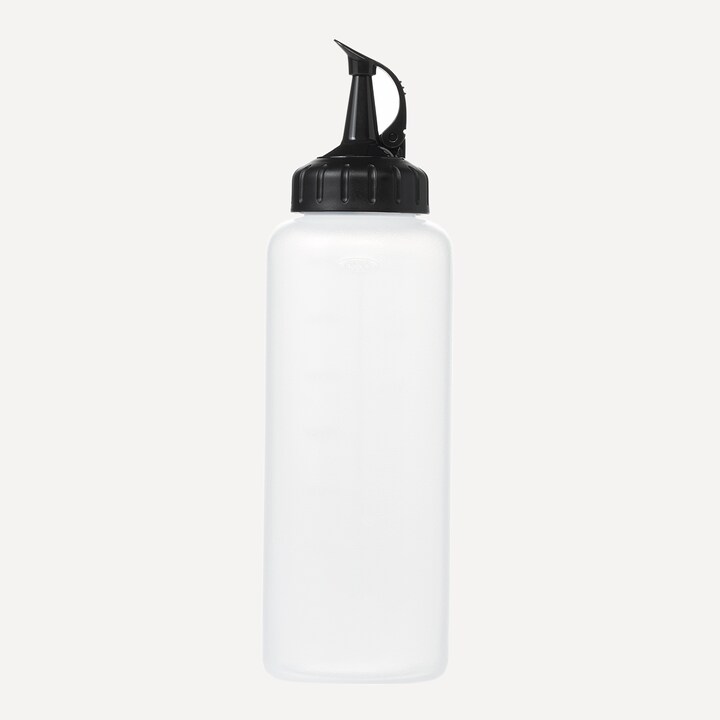 Garrafa doseadora fabricada em plástico flexível isento de BPA, que permite controlar a quantidade de líquido ou molho ao pressionar com uma só mão. Inclui marcas de medição em mililitros, onças e chávenas para facilitar a dosagem de ingredientes e foi concebida para aplicar molhos, chocolates, óleos e decorar pratos.