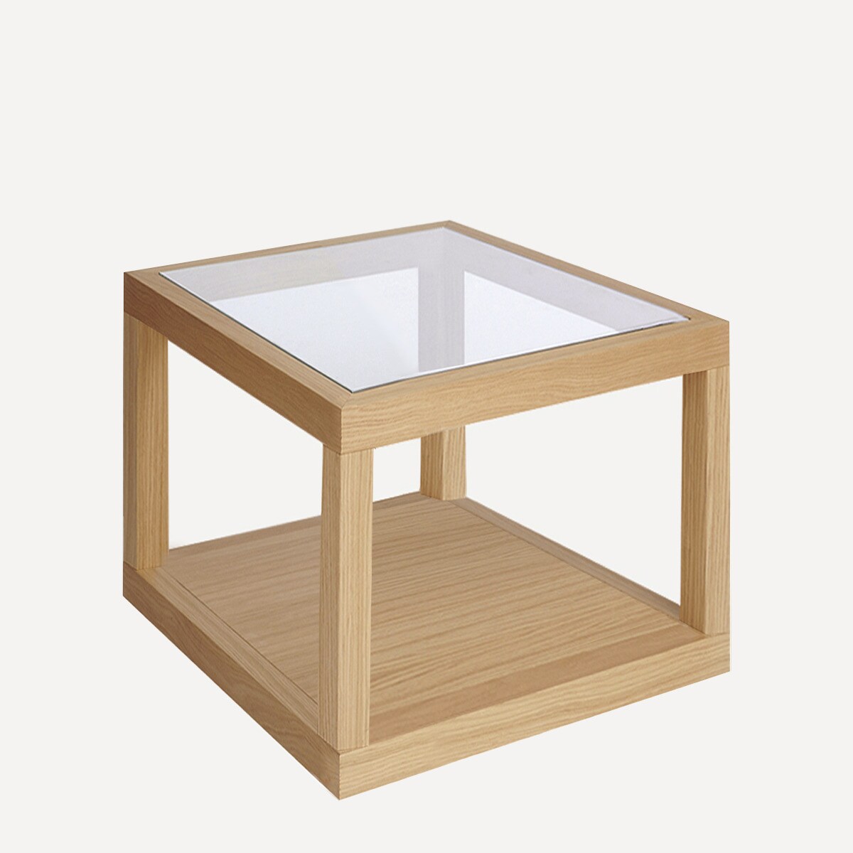 Mesa de apoio com estrutura em chapa de carvalho natural e tampo em vidro temperado, concebida para oferecer uma superfície adicional funcional em diferentes ambientes.