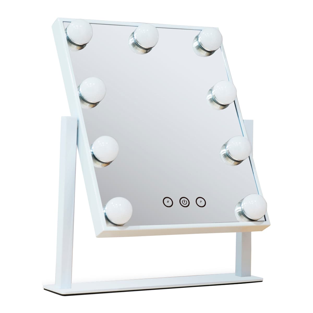 Espelho de aumento tipo camarim com lâmpadas LED a toda a volta do vidro. Dispõe de interruptor com sensor tátil e permite rotação de 360 graus. Alimentado através de cabo USB.