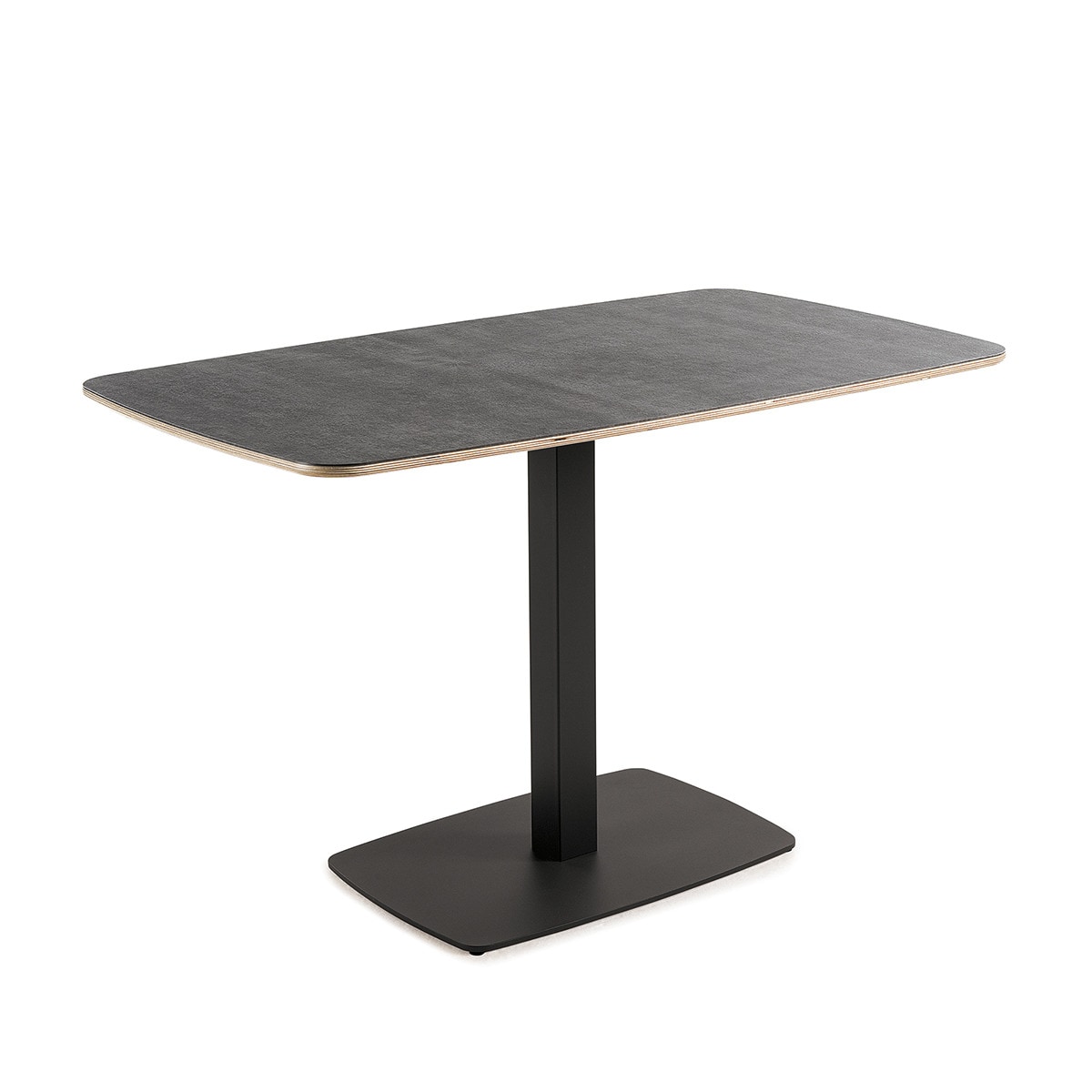 Mesa de cozinha semi-oval com 7x7 cm de base central. A base é feita de aço pintado em exposi e a superfície em contraplacado de bétula em compacto.