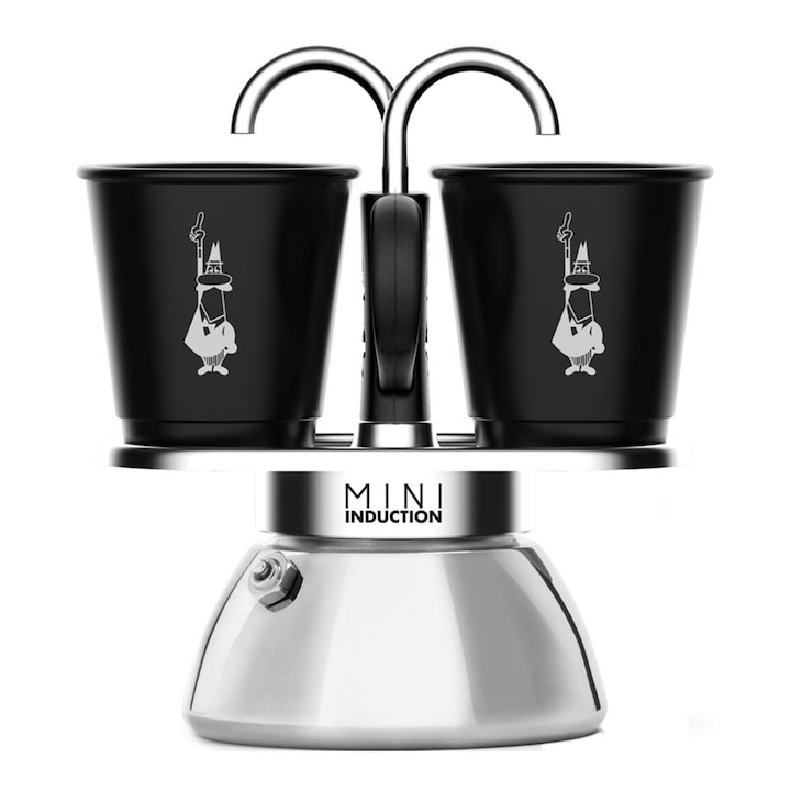 Mini Express Induction Coffee Maker da marca italiana Bialetti, uma máquina de café muito original que serve café diretamente nas suas duas chávenas integradas. As chávenas são colocadas sobre uma placa de alumínio, que assegura que as chávenas são aquecidas durante o processo de preparação, servindo o expresso à temperatura perfeita. Adequado para todos os tipos de incêndios.