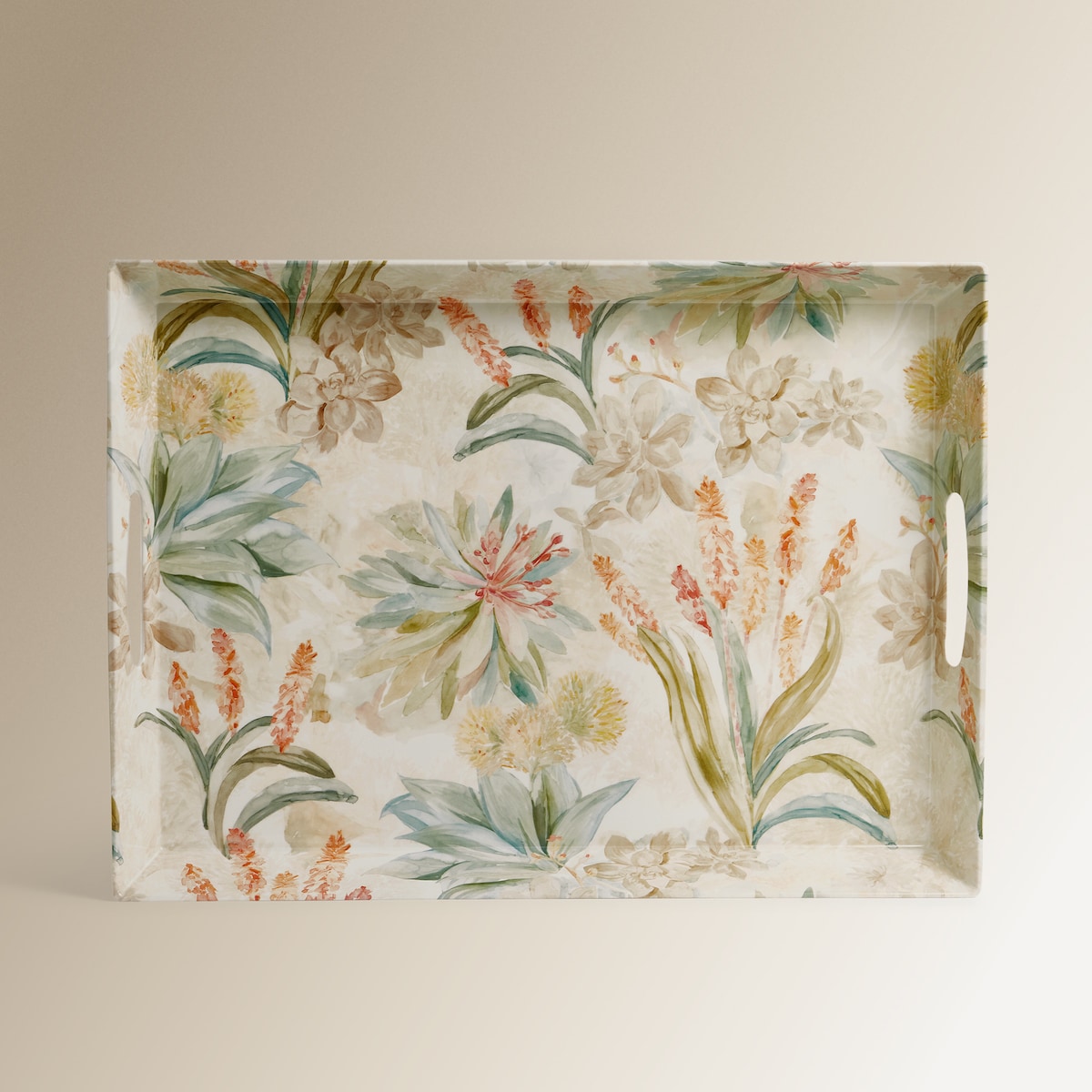 Bandeja de servir feito de melamina, um material muito resistente, ideal para o ar livre. Tem pegas e bordos elevados que o tornam confortável e fácil de transportar, sem se preocupar com derrames inesperados. Destaca-se pelo seu design floral marcante em tons multicoloridos.