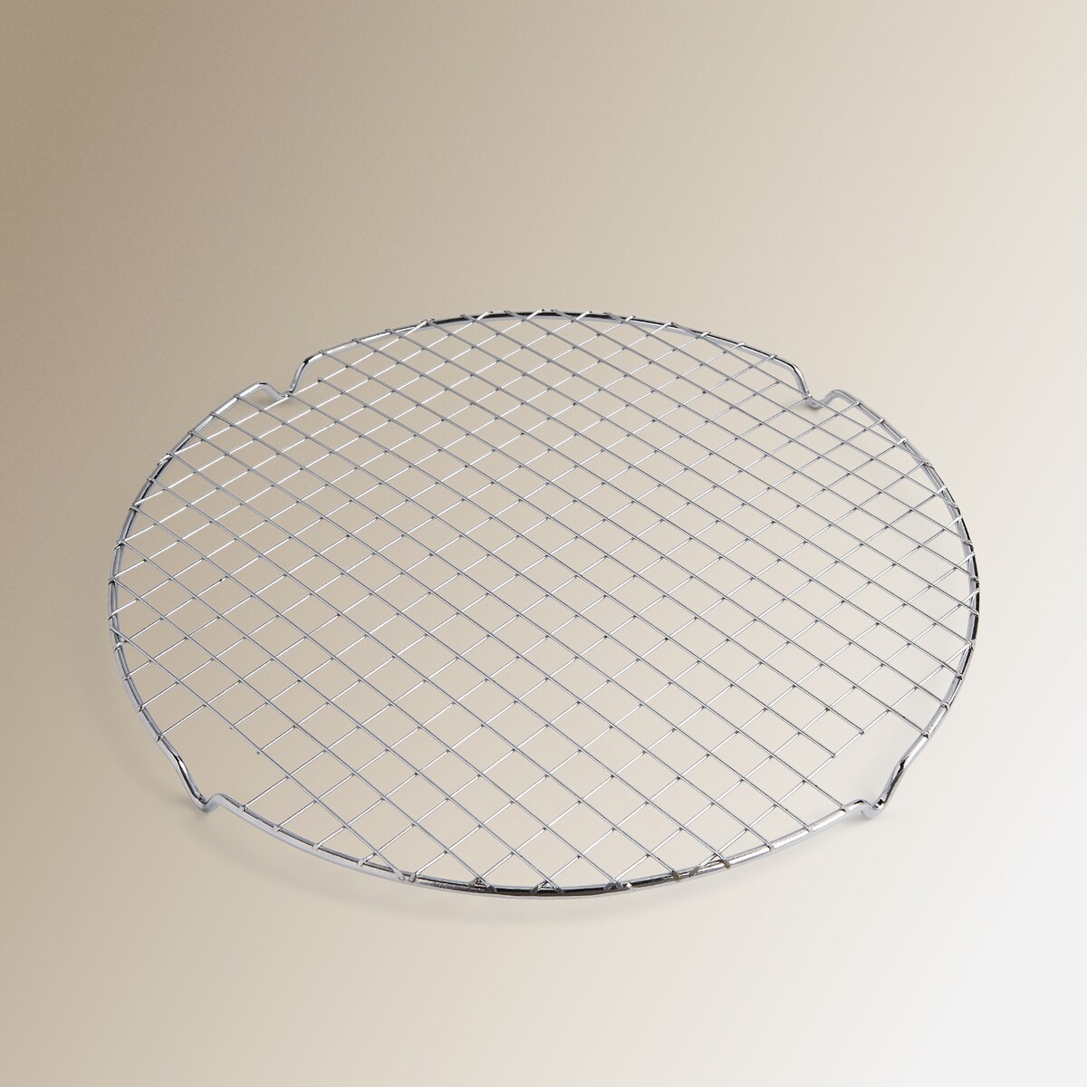 Grelha circular em ferro cromado com superfície antiaderente, concebida para arrefecer preparações caseiras após saírem do forno.