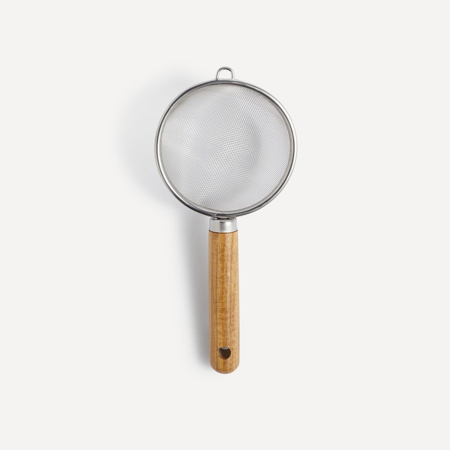 Prático coador feito de aço inoxidável com um cabo de madeira de acácia de alta qualidade. Tem 2 suportes extra para descansar em tachos e panelas.