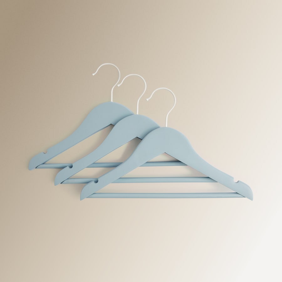 Conjunto de 3 cabides de madeira para crianças. O seu tamanho adapta-se perfeitamente à roupa dos mais pequenos. Disponível em três cores.