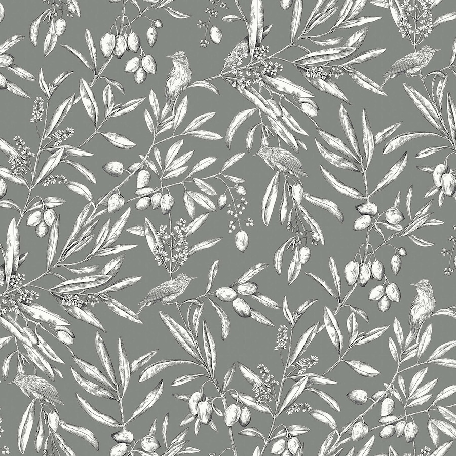Papel de pintado com desenho vegetal de azeitonas, folhas e pássaros.