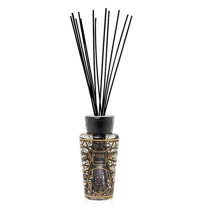 O difusor Arabian Nights emana um perfume amadeirado que encherá a sua casa. O recipiente de vidro, decorado com uma serigrafia preta e dourada, é extremamente requintado e evoca os palácios do Médio Oriente. Os preciosos motivos decorativos, inspirados nas famosas mashrabiyas árabes, conferem ao frasco uma identidade decorativa que o torna praticamente numa peça de coleção.