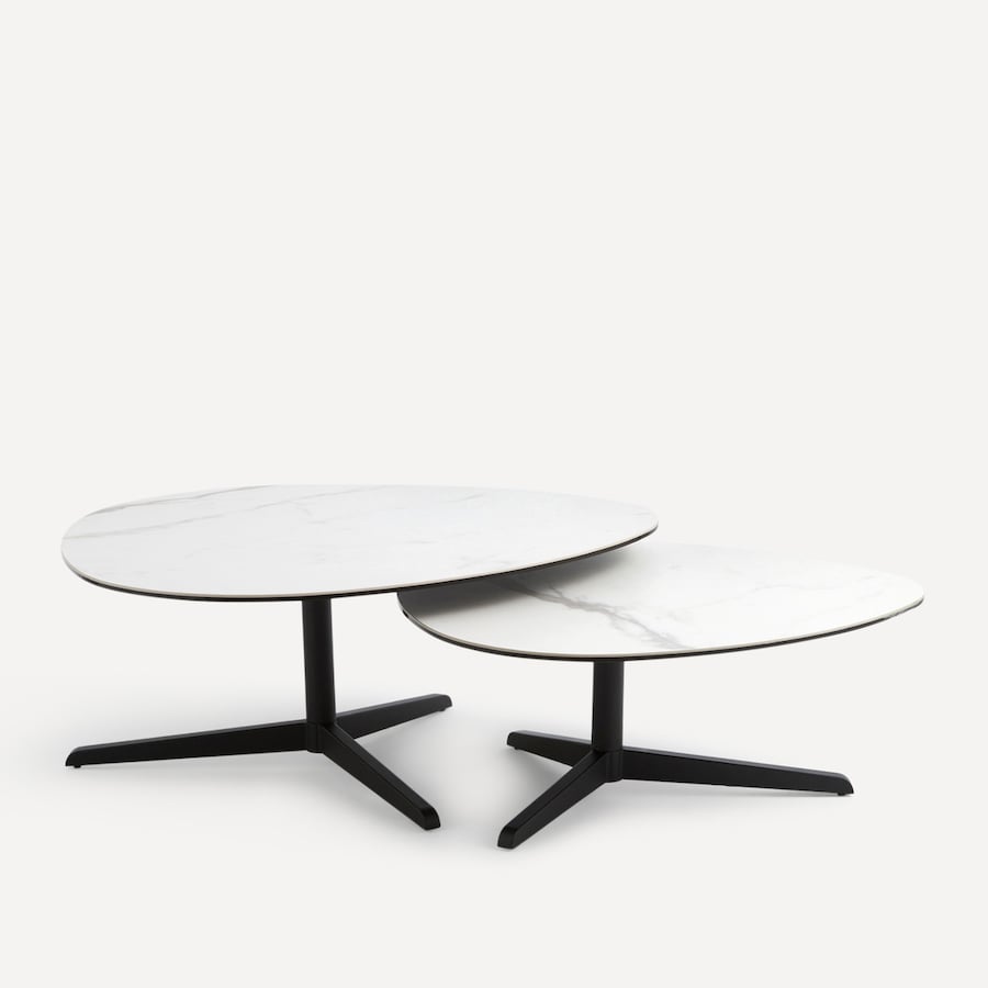 Conjunto de 2 mesas de centro com pernas em metal lacado a preto e tampo em cerâmica branca de forma irregular.