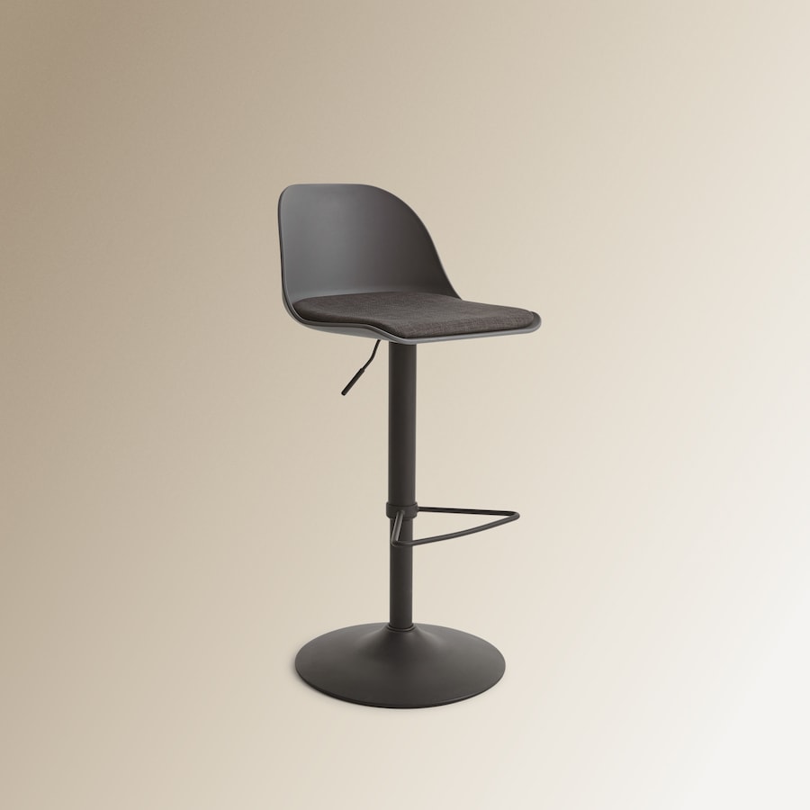 Banco de cozinha confortável com assento ergonómico, com uma estrutura metálica e assento em polipropileno reforçado com uma almofada têxtil para amortecer o assento.