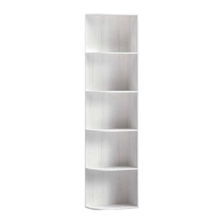 Móvel de canto reversível, ou seja, pode ser colocado à direita ou à esquerda, em melamina e com uma grande capacidade de arrumação. É fixado à parede do teto ao chão e inclui quatro prateleiras.