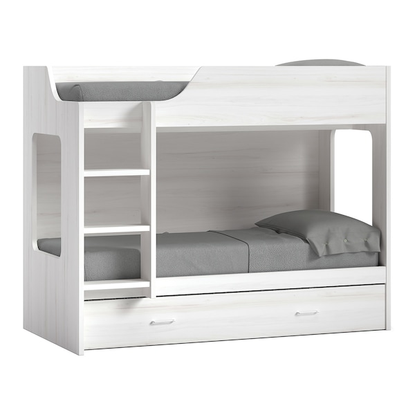 Beliche esquerdo para dormitório de jovens com duas camas expostas e uma terceira cama de trundle que é puxada para fora com um sistema de arrasto com rodas. Toda a roupa de cama é para um colchão de 190x90 cm.