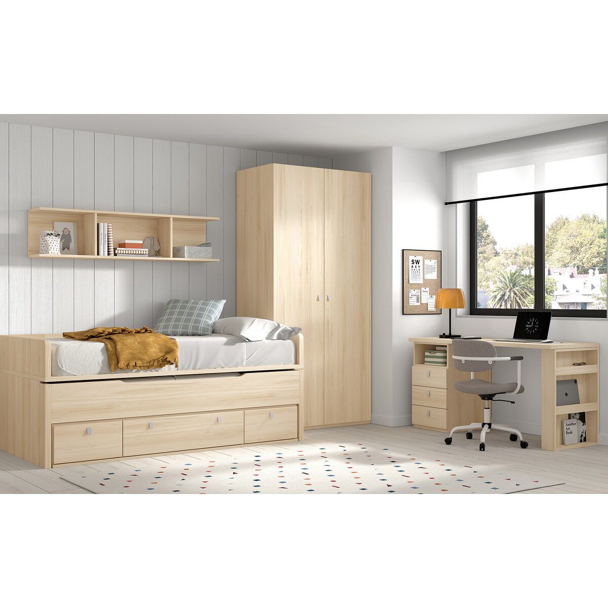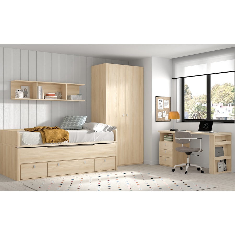 Cama compacta com cama de rodízio oculta com 3 gavetas com rodízios para uma fácil remoção. Ambas as camas incluem o estrado, mas não incluem o colchão. Recomenda-se a utilização de colchões de 190x90cm para a cama superior e de 180X90cm para a cama inferior. A altura das cabeceiras é de 24 cm.