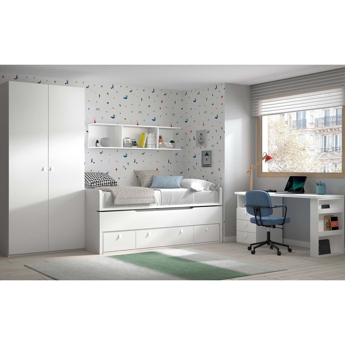 Cama compacta com cama de rodízio oculta com 3 gavetas com rodízios para uma fácil remoção. Ambas as camas incluem o estrado, mas não incluem o colchão. Recomenda-se a utilização de colchões de 190x90cm para a cama superior e de 180X90cm para a cama inferior. A altura das cabeceiras é de 24 cm.