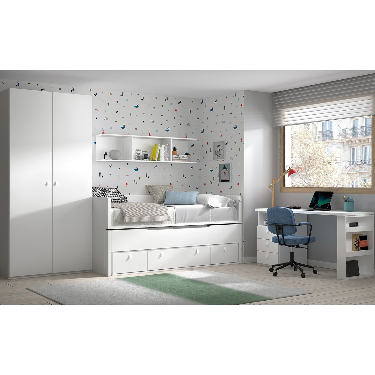 Cama compacta com cama de rodízio oculta com 3 gavetas com rodízios para uma fácil remoção. Ambas as camas incluem o estrado, mas não incluem o colchão. Recomenda-se a utilização de colchões de 190x90cm para a cama superior e de 180X90cm para a cama inferior. A altura das cabeceiras é de 35 cm.