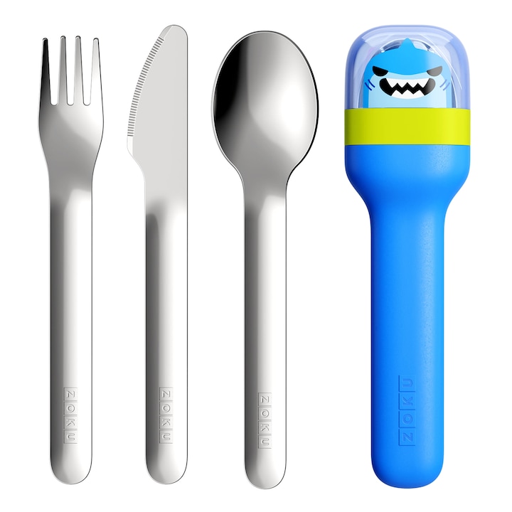 Conjunto de talheres infantis que inclui um garfo, uma faca e uma colher, acompanhado de uma caixa para os guardar e transportar de forma higiénica. Os talheres são fabricados em aço inoxidável e são adequados para lavagem na máquina de lavar loiça.