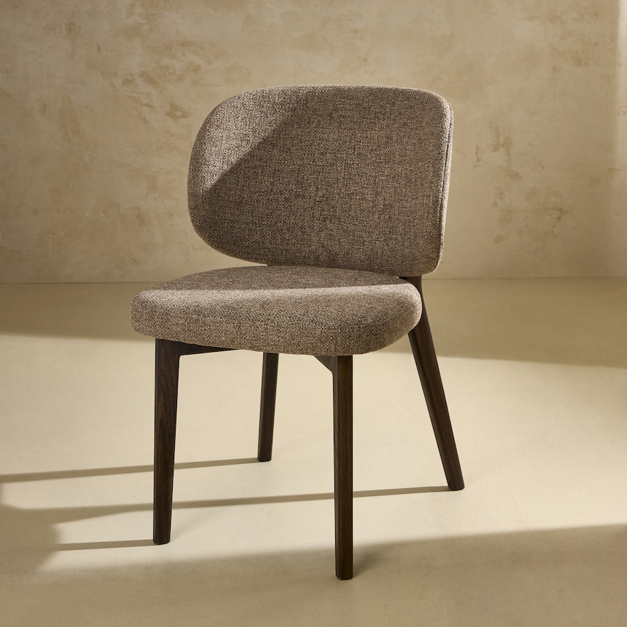 Cadeira de sala de jantar com estofos em tecido e estrutura de pernas em madeira maciça, concebida para oferecer conforto e funcionalidade em espaços de refeição.
