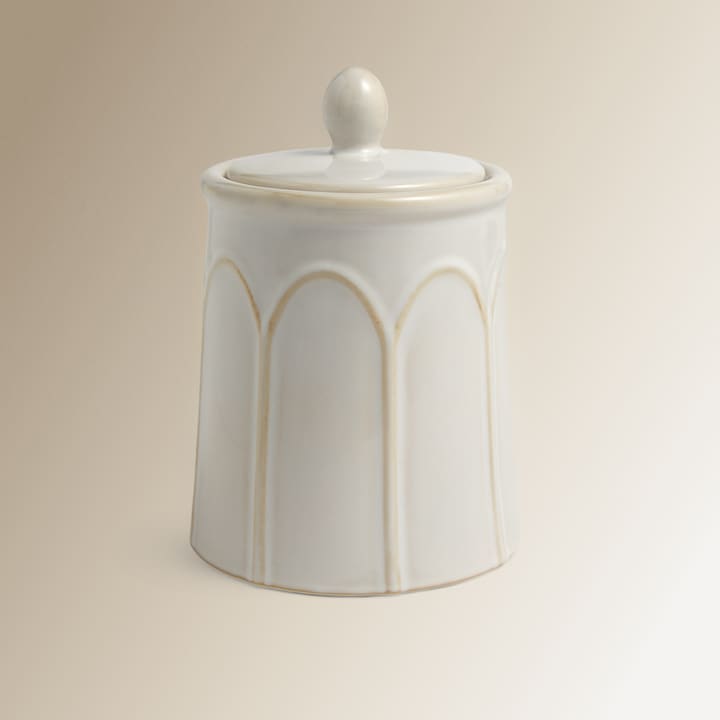 Frasco de cerâmica de grés com tampa do mesmo material, concebido para armazenar alimentos ou diversos tipos de produtos. É adequado para utilização na máquina de lavar loiça, no micro-ondas e no forno até uma temperatura de 160 oC.