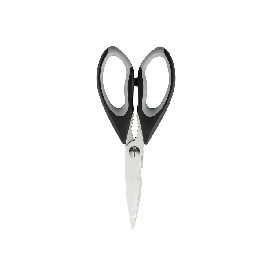 Tesoura de cozinha multiusos com lâmina em aço inoxidável e cabo ergonómico em plástico, muito confortável de utilizar.