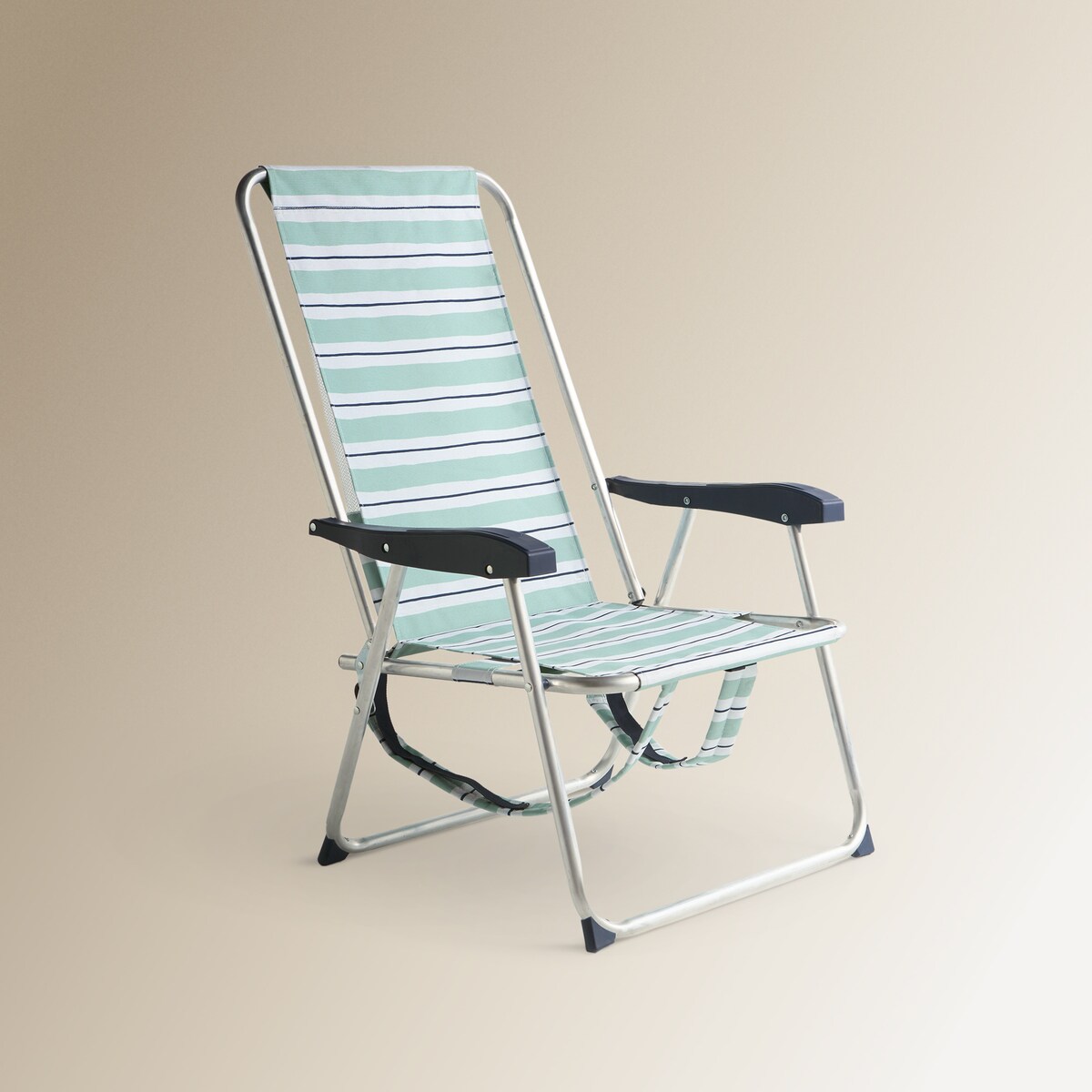 Cadeira de praia dobrável em estrutura de alumínio e poliéster com estampado às riscas. Para um transporte cómodo, tem alças para a transportar como uma mochila.