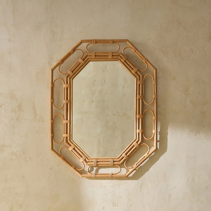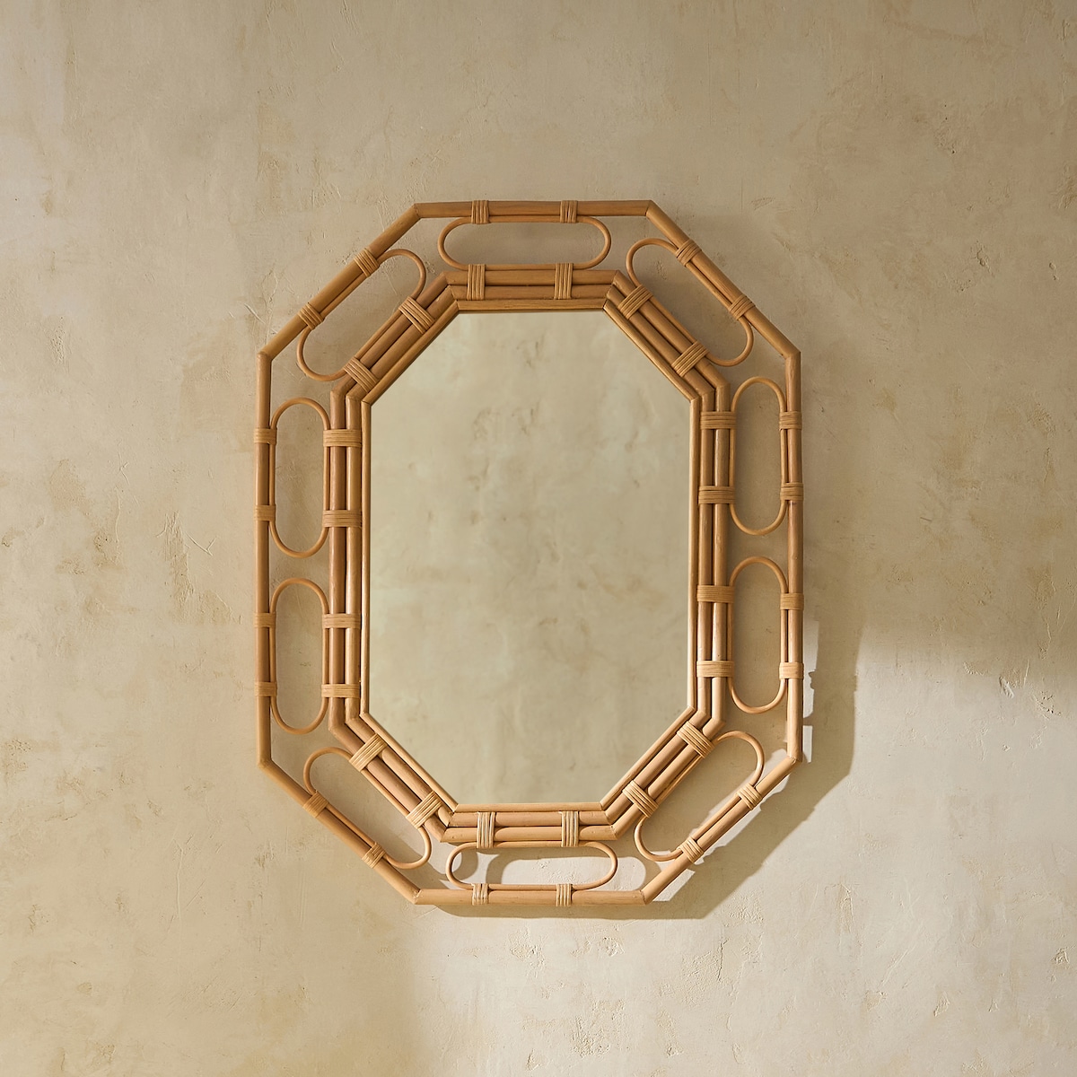 Espelho de parede fabricado artesanalmente em ratã, concebido para utilização na decoração de interiores.