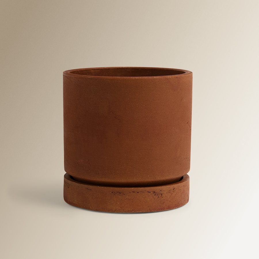 Vaso de cimento com design clássico e funcional, que inclui um prato que se encaixa perfeitamente na parte inferior.