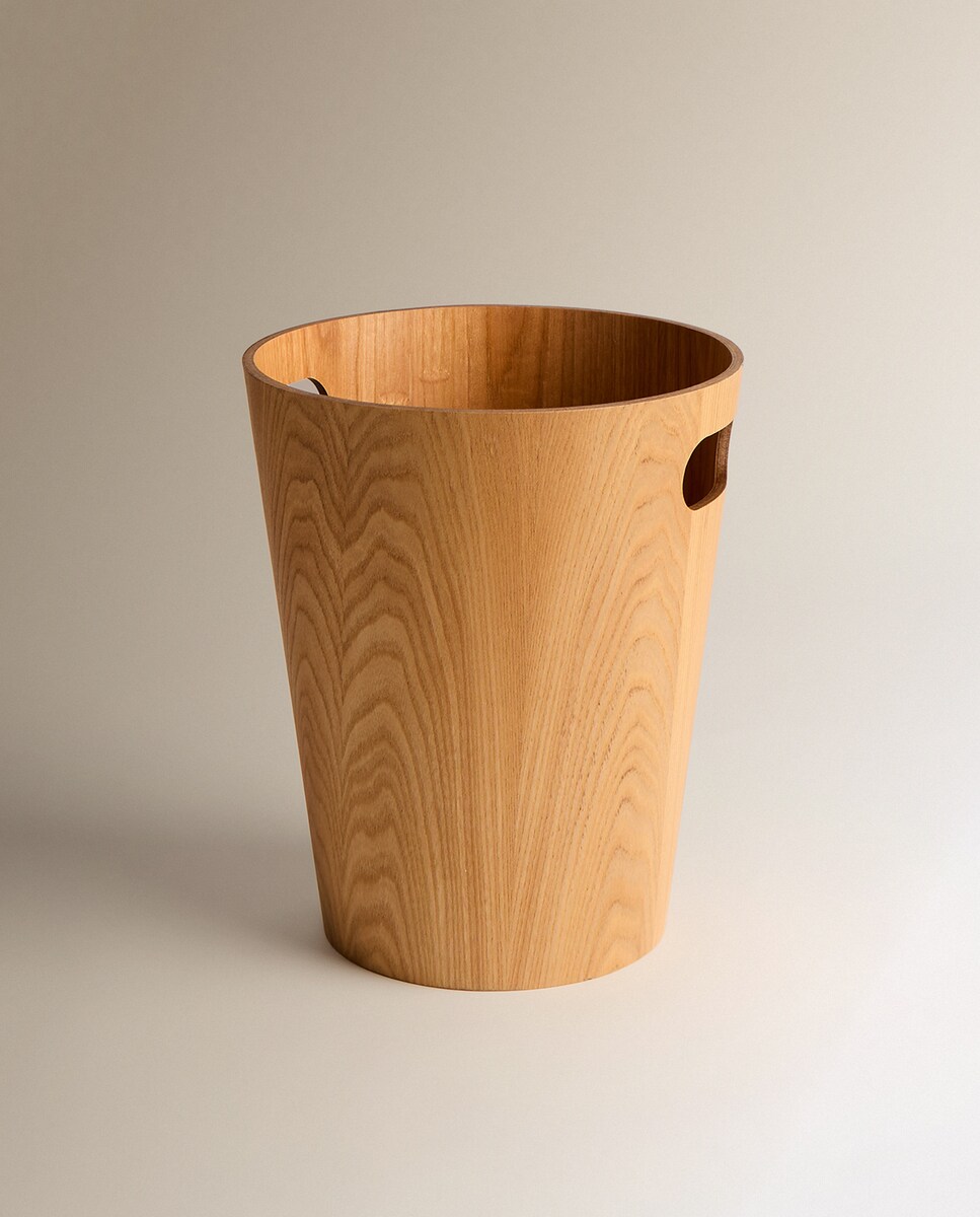 Balde do lixo para uso em escritório, fabricado em madeira, com um design funcional e linhas simples. Inclui duas asas laterais para facilitar o transporte e é adequada para gabinetes ou quartos, sendo compatível com diferentes tipos de mobiliário.