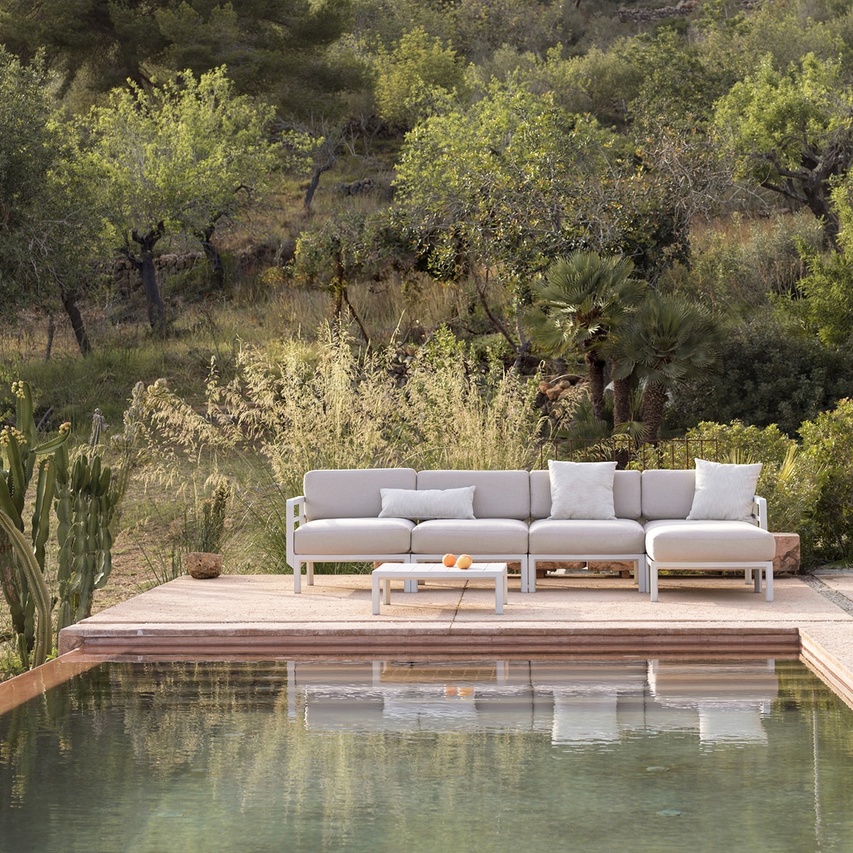 Coleção modular de jardim da série Máximo. Todas as peças têm uma estrutura branca em fibra de vidro de polipropileno regenerado com tratamento anti-UV. O tecido é composto por tecido acrílico Sunbrella®: 50% de fibra acrílica Sunbrella® reciclada tingida em solução, 47% de fibra acrílica Sunbrella® tingida em solução, 3% de poliéster.