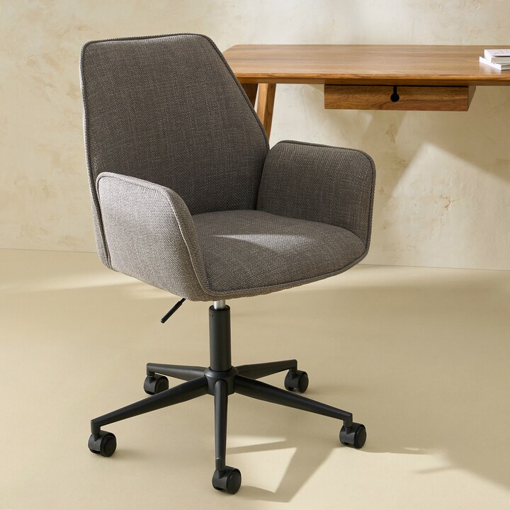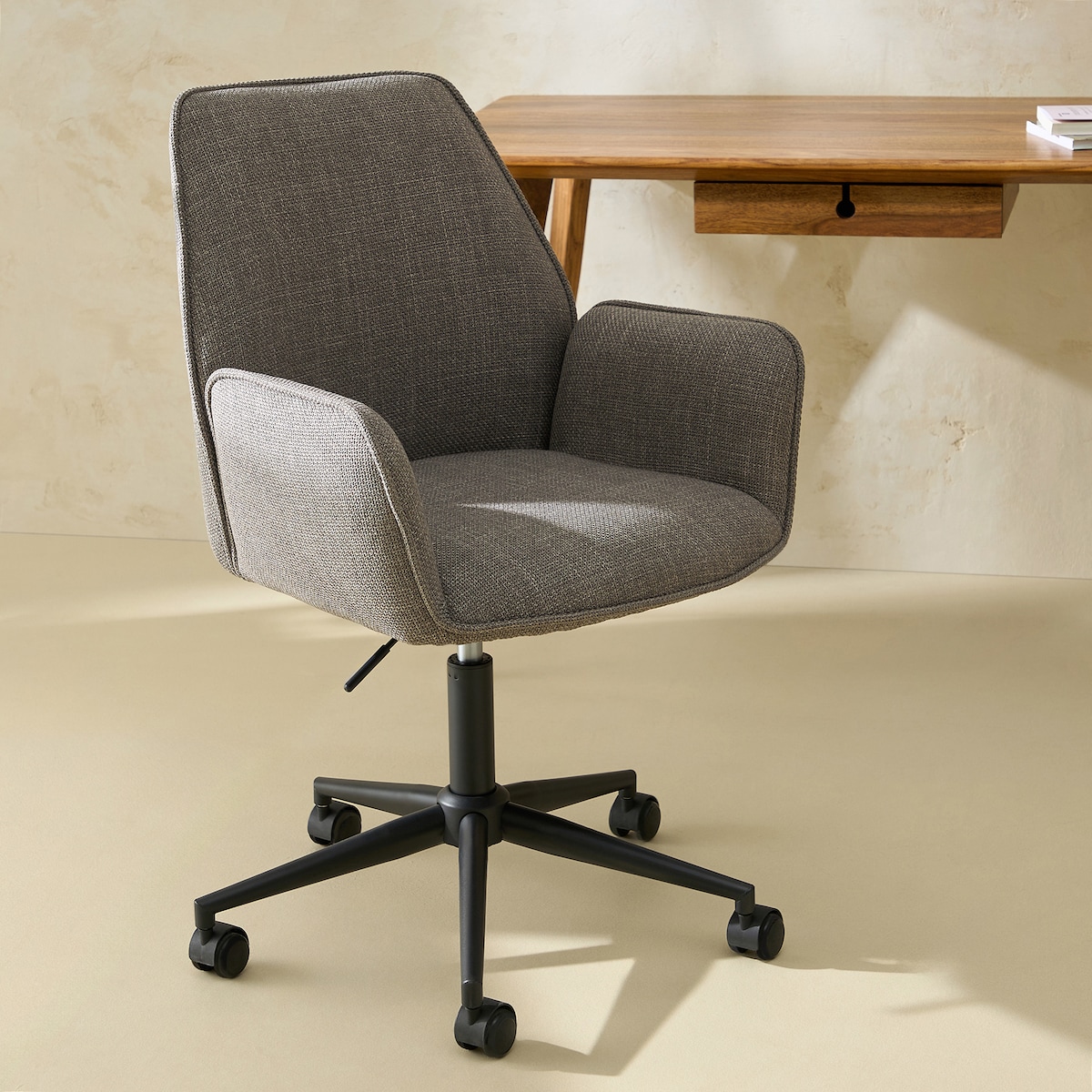 Cadeira de secretária estofada, com sistema de elevação por pistão a gás e mecanismo basculante, para garantir conforto durante a utilização.