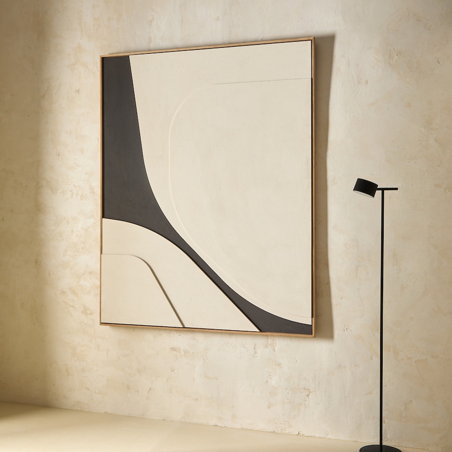 Quadro abstrato elaborado com tinta plástica e aparas de madeira reciclada sobre papel de alta densidade, modelado por desbaste mecânico e acabado com lixagem e arestas trabalhadas manualmente, incluindo uma moldura em madeira maciça de carvalho.