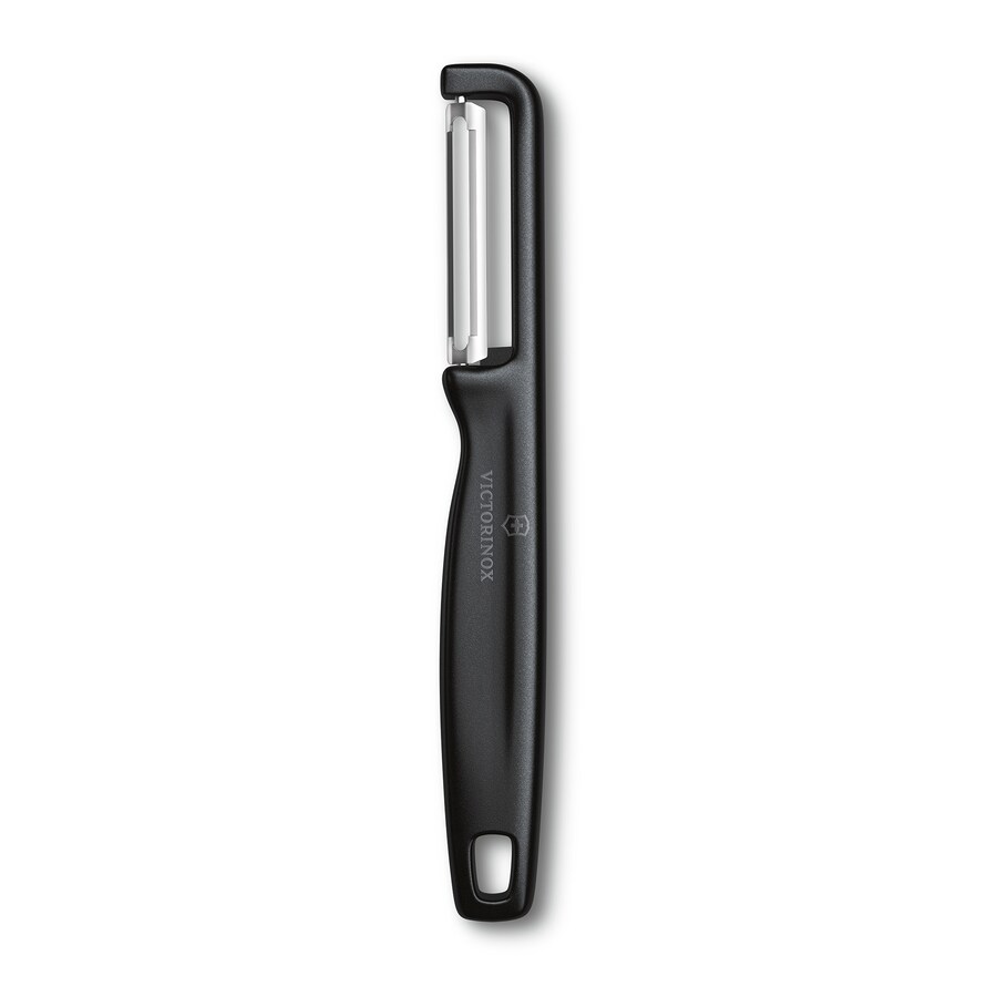 Descascador com lâmina recta, concebido para se adaptar a qualquer mão, fabricado em polipropileno resistente. Permite descascar fruta de forma arredondada e fazer aparas de chocolate.