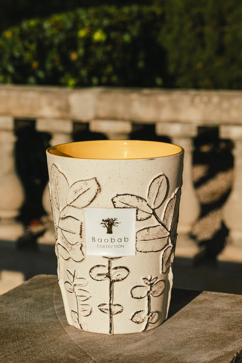 A vela perfumada Calanque, na cor da sua cerâmica branca mate, homenageia as magníficas rochas que lhe dão o nome. Moldados à mão por ceramistas portugueses, os motivos vegetais, em forma de folhas de eucalipto, desdobram-se sobre o vaso como uma obra de arte.