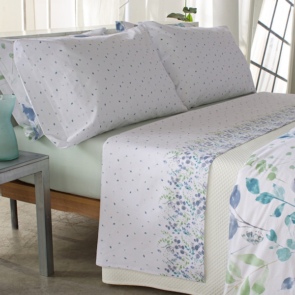 Conjunto de lençóis com desenho de flores e folhas em tons de verde e azul.