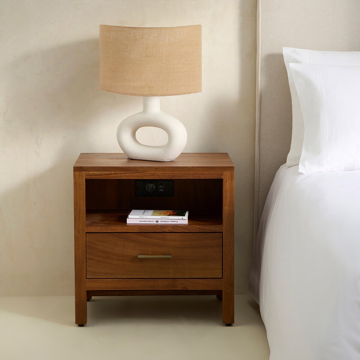 Mesa de cabeceira da coleção Oslo, uma peça de mobiliário que se adapta à vida moderna ao incluir funcionalidades eléctricas (incorporando um ponto de carregamento: ficha, 1 porta USB e 1 porta Tipo C).