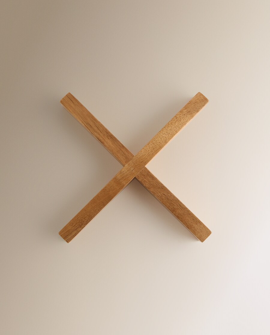 Base para tachos em forma de cruz, concebida para proteger mesas e toalhas de queimaduras. Fabricada em madeira e desmontável, para facilitar a arrumação e poupar espaço.