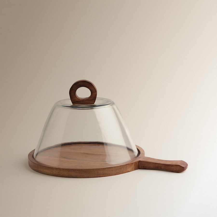 Queijeira composta por uma base de madeira de acácia com pega, concebida para servir queijos diretamente à mesa.