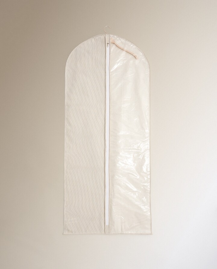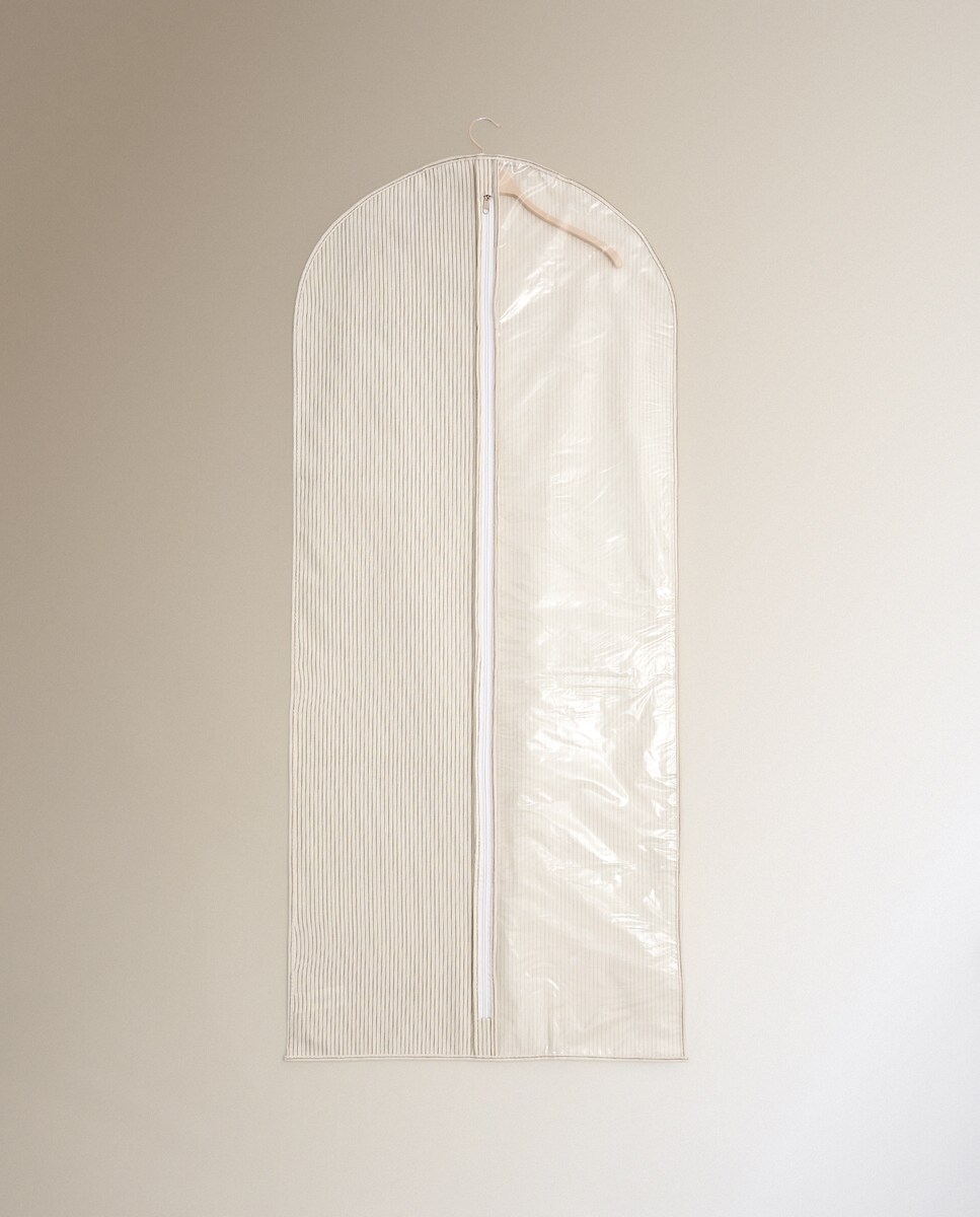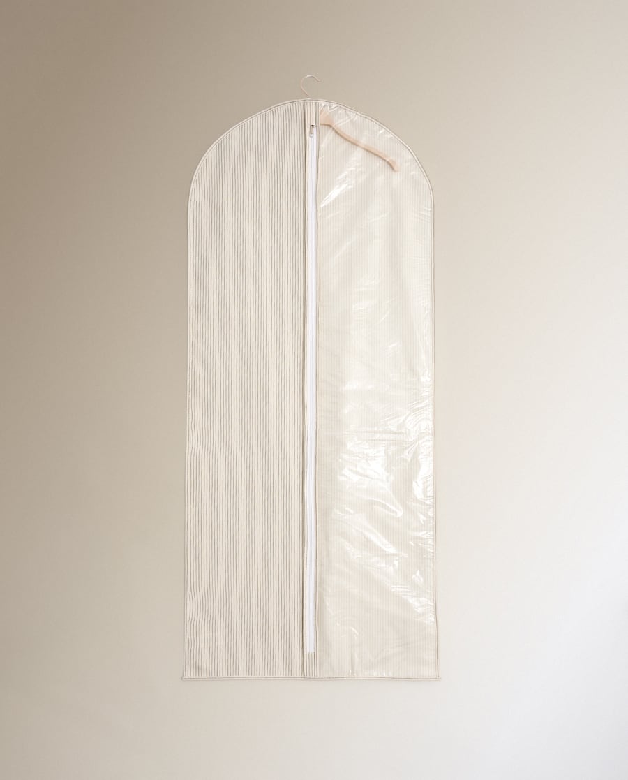 Capa para guardar e proteger casacos, fabricada em poliéster com acabamento tipo algodão. Dispõe de fecho frontal de correr para facilitar a sua utilização.