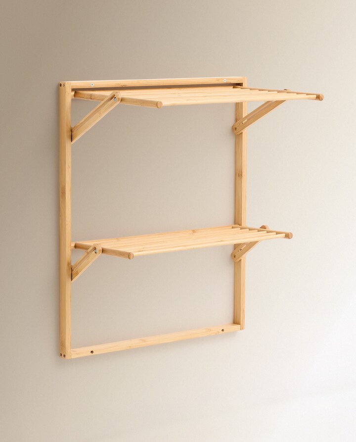 Estendal de parede com duas prateleiras com barras, concebido para optimizar o espaço em interiores. É fabricado em madeira de bambu envernizada, um material natural resistente. O estendal destina-se a utilização em interiores para preservar a qualidade da madeira e pode ser dobrado para facilitar a arrumação.