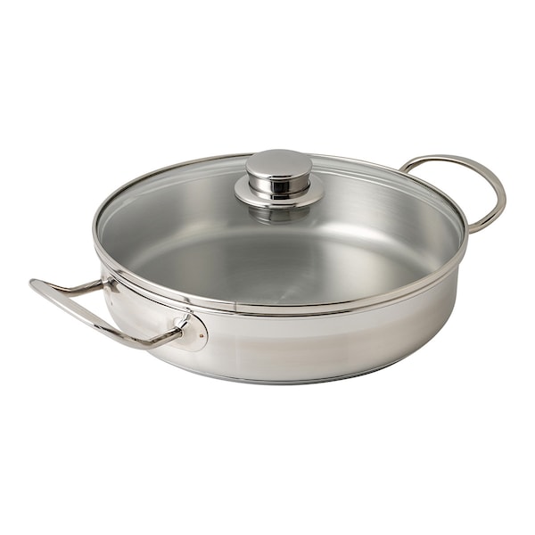Fabricado em aço inoxidável 18/10 com difusor de fundo triplo, que distribui o calor por toda a peça e a aquece uniformemente. Inclui também uma tampa de vidro, que permite verificar sempre o ponto de cozedura sem o alterar.