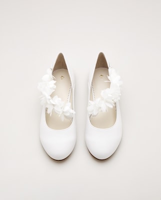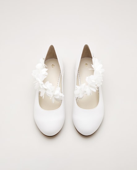 Sapatos de Presilha em Pele com Flores de Organza e Biqueira Redonda