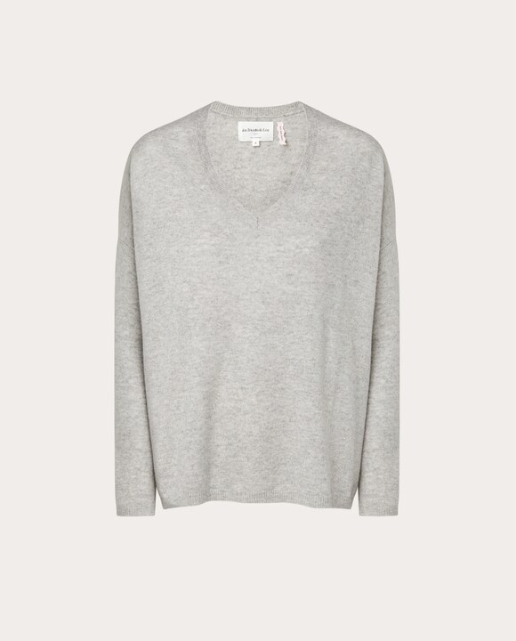 Camisola de caxemira com decote em V, mangas compridas e acabamentos canelados.