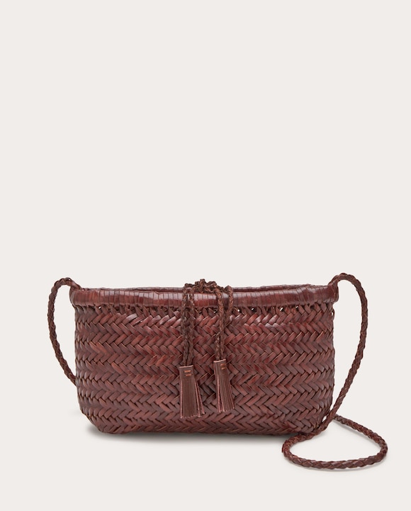 Mala a tiracolo em pele tecida à mão Minsu com base oval, alça entrançada e fecho superior com cordões.
