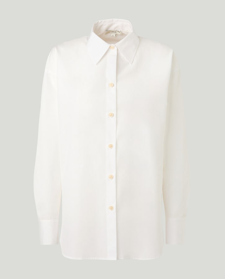 Camisa de algodão com lapelas em bico, manga comprida, detalhe de abertura nas laterais e fecho com botões.