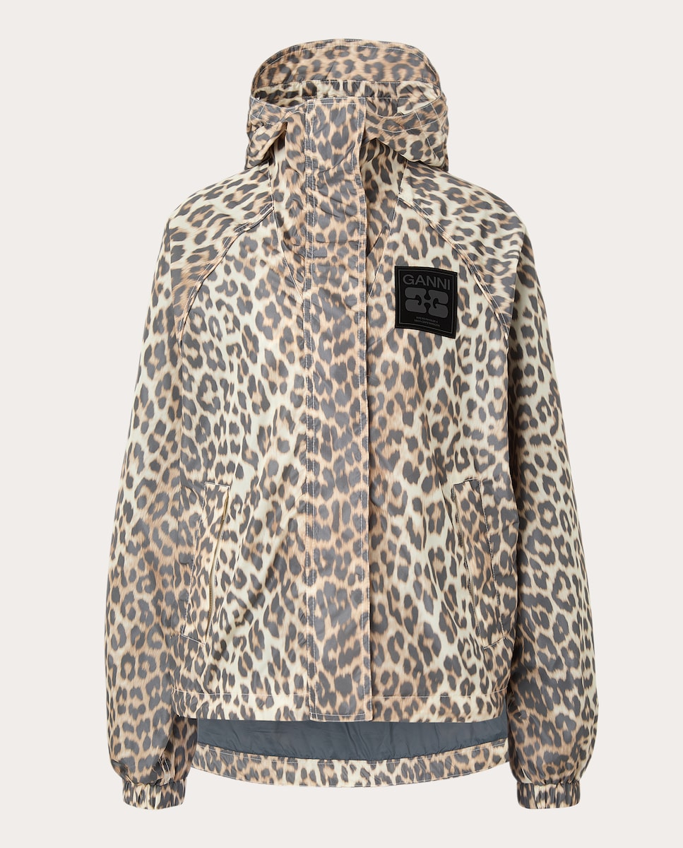 Casaco com estampado animal print, gola alta, bolsos laterais, mangas compridas elásticas e fecho frontal com zíper.