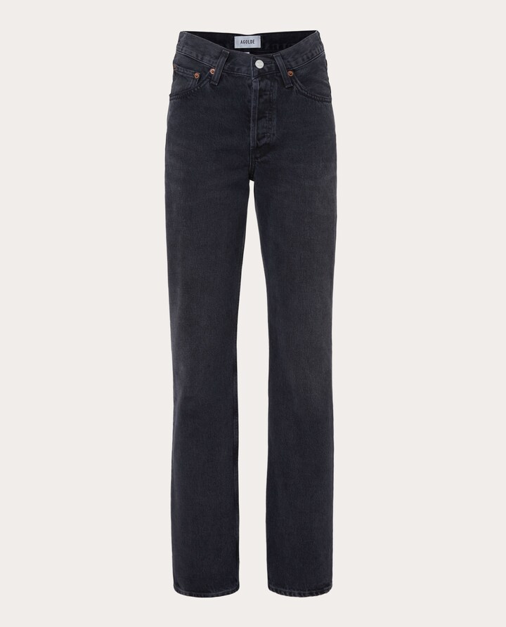Calças de algodão Kelly de cintura em V, de perna direita, com bolsos laterais e fecho de correr e botão.